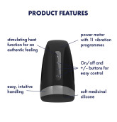 The Men Heat Vibration combines a masculine design with the simple, intuitive operation - using the on/off and +/- buttons you can control it comfortably with one hand, even when things get a little wild. Thanks to its wide opening, you can use the masturbator even when your penis is not erect and warm yourself up from 0 to 100 in no time at all. Lose yourself in your fantasies and be carried to the peak of pleasure with 11 different vibration levels.