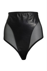 The solid leather front panel is the very definition of luxury underwear, and pulls you in as the high leg mesh panels create the most flattering shape.